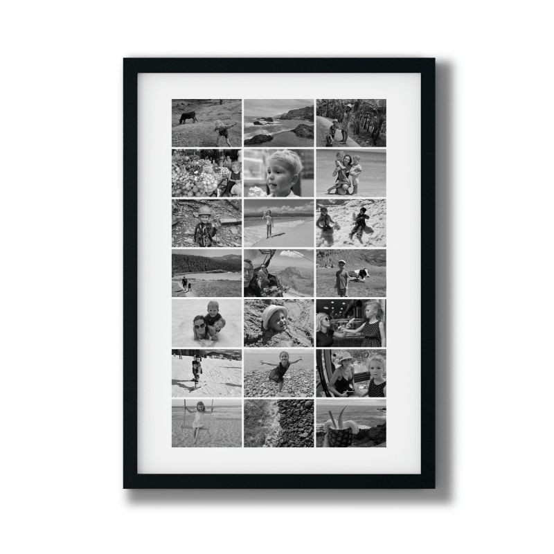 Vytvořte si fotokoláž z 21 fotek na šířku do fotografie o velikosti 40×60 cm vám vytiskneme na profesionální matný fotopapír o gramáži 240g. Bude mít 4 cm širokou paspartu v barvě, kterou si můžete vybrat dle sebe. Vytvoříme vám i kompletní fotoobraz, když fotografii umístíme do obrazového rámu pod antireflexní plexi, které výrazně snižuje odlesky v místnosti.
