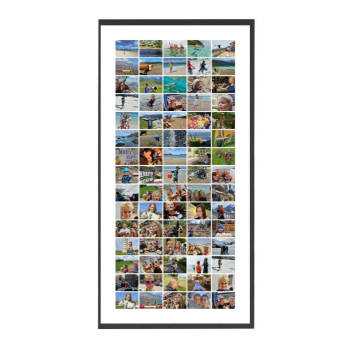 Vytvořte si fotokoláž ze 75 fotek na šířku o rozměru fotografie 50×100 cm. Vytiskneme ji na profesionální matný fotopapír o gramáži 240g. Vytvoříme vám i kompletní fotoobraz, když fotografii umístíme do obrazového rámu pod antireflexní plexi, které výrazně snižuje odlesky v místnosti. Vše si upravíte v konfigurátoru.